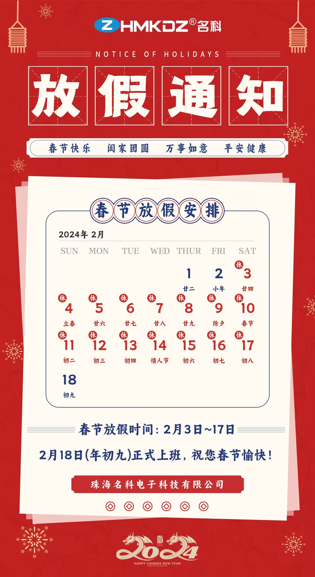 为了感谢您在过去一年对我们的信任与支持,我们将从2024年2月3日至2024年2月17日进行春节放假。在此期间,我们的办公室将暂停日常业务。